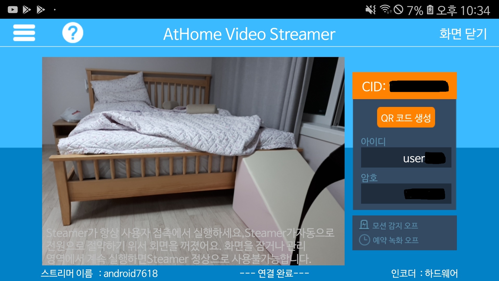 그런데 사용을 하다보니 가끔 접속이 불안정해서 화면 확인이 잘 안될떄가 많았고, 자주 사용하진 않았지만 음성 전달도 원활이 되지 않을 때가 많았습니다. 이런 이유로 현재는 AtHome 사용하지는 않고 있습니다.